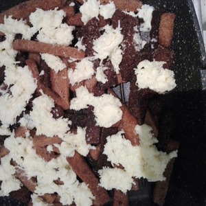 Когда гренки обжарятся со всех сторон, выкладываем намазку, прикрыв крышкой, но не до конца, чтобы пар не конденсировался в сковородке и гренки не размокли,