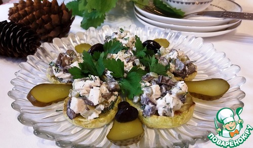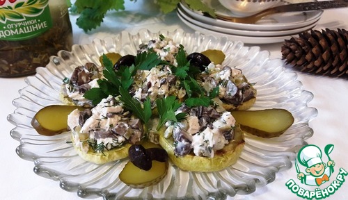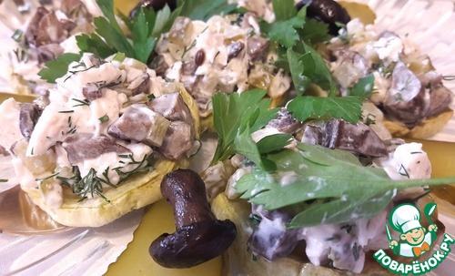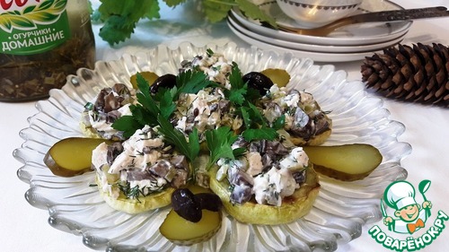 Дорогие Поварята! Хочу предложить вам приготовить замечательную закуску! Обжаренные кабачки придают блюду необыкновенный вкус! Маринованные огурчики, соленые грибочки и куриное филе. Как же это вкусно!!! Попробуйте! И я думаю, что вы останетесь довольны!!!