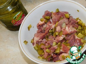 • Свинину нарезаем на кусочки и перемешиваем с нарезанными маринованными огурцами.
