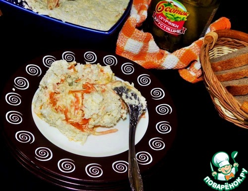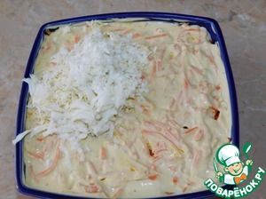 Выкладываем слой моркови по-корейски и сверху последним слоем тертые яйца.