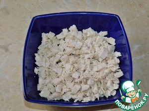 Куриное филе мелко нарезать и выложить на дно салатницы. Этот слой и все последующие смазываем майонезом.