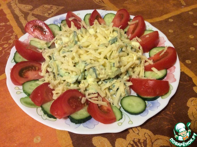 Заправить огурцы с яйцом майонезом, посолить и поперчить по вкусу. Выложить салат в середину блюда.