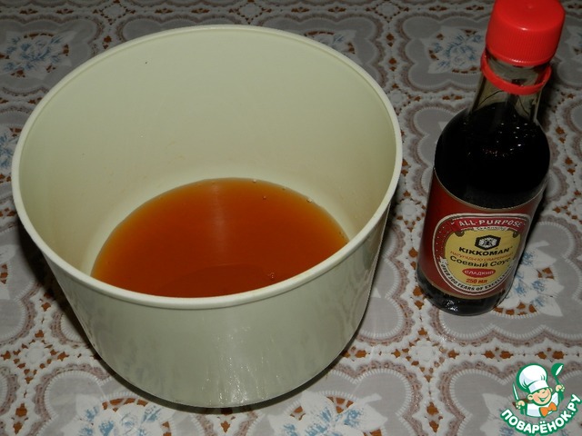 В тёплой кипячёной воде развести соевый сладкий соус Киккоман. Он придаст нашей выпечке приятный цвет и пикантный аромат.