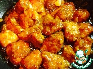 Убавить огонь до среднего и потушить, постоянно помешивая минут 5-7. Соус быстро густеет, филе получается "в глазури"