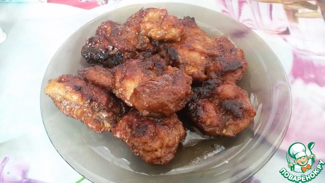 В оставшийся маринад влить 100мл воды и вылить содержимое к курице