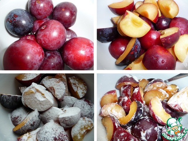 Сливу нарезать четвертинками, пересыпать крахмалом, перемешать.