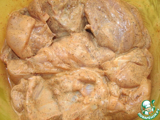... добавить сметану и специи, перемешать. Чашку закрыть пленкой и оставить мариноваться минут на 20.