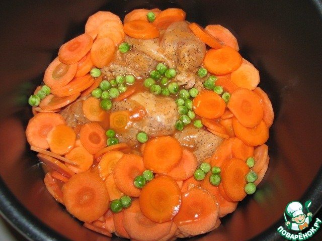 В чашу мультиварки выложить курицу и овощи. Влить морковный сок.