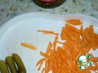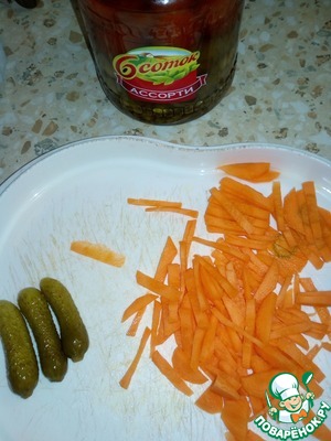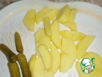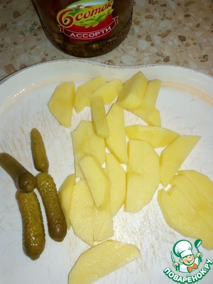 Картофель также нарезаем соломкой. У меня были корнишоны из "Ассорти" от ТМ "6 Соток", поэтому я их не резала. Крупные огурцы можно нарезать произвольно. |