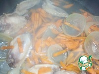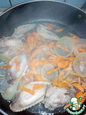 Через 30 минут добавляем нарезанную морковь к крыльям. Доводим до кипения и тушим на медленном огне 10 минут. |