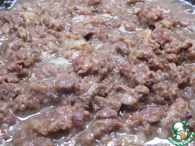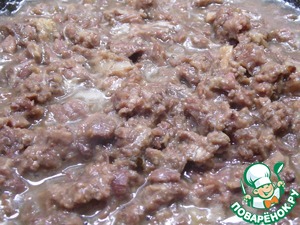 Тушенку выложить в сковородку, поставить на огонь, обжаривать, помешивая, пока не вытопится вся жидкость (минут 10).