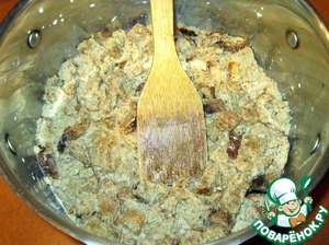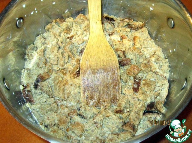 • Заливаем сухари сливками и водой. Перемешиваем и оставляем набухать на 10 минут.