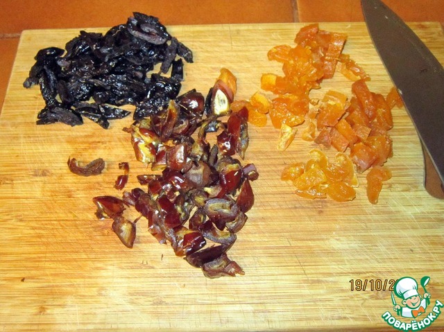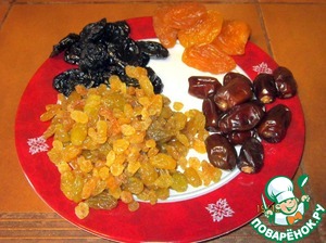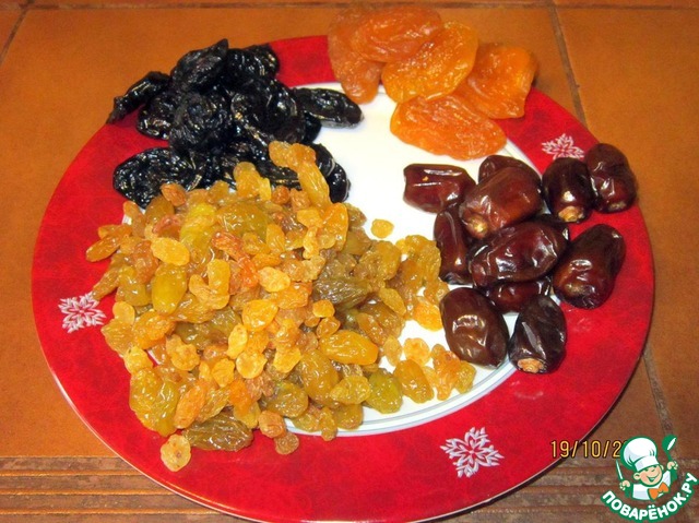 • По 100 г сушёного белого мелкого и крупного кишмиша, 100 г сушёного чернослива, 100 г сушёных персиков, 100 г фиников. Хорошо моем.
