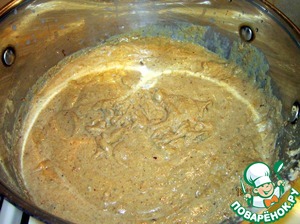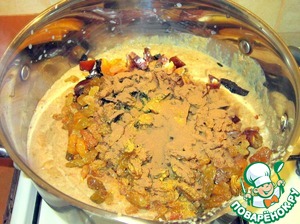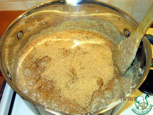 • Добавляем сахар и хорошо всё перемешиваем. Ставим на очень медленный огонь на 10 минут. Постоянно перемешиваем.
