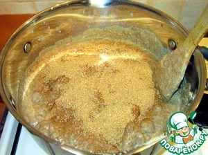 Добавляем сахар и хорошо всё перемешиваем. Ставим на очень медленный огонь на 10 минут. Постоянно перемешиваем.