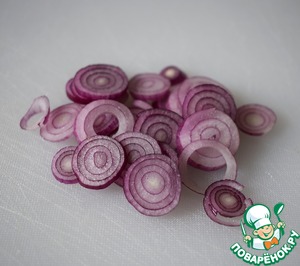 Красный лук нарезать. У меня был маленький, поэтому я взяла 2 шт и смело нарезала кольцами.