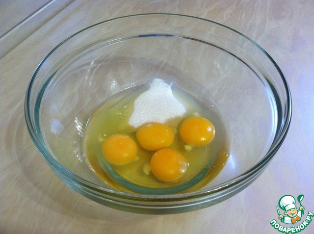 Приступим к приготовлению. В глубокую миску разбиваем яйца и добавляем сахар, щепотку соли и ванилин.