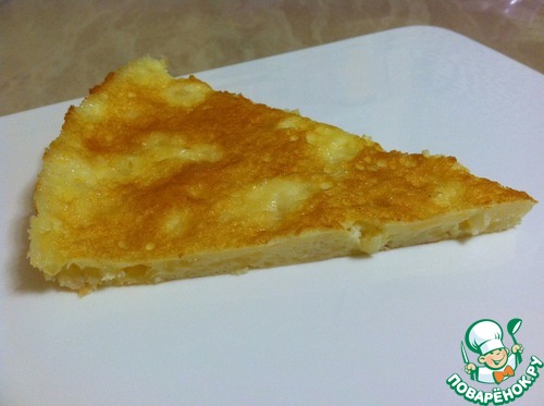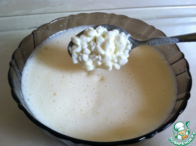 Добавить в яичную смесь творог. Сливки можете слить, а можете и оставить, они не испортят вкус готового блюда. Всё, так называемое "тесто" готово.
