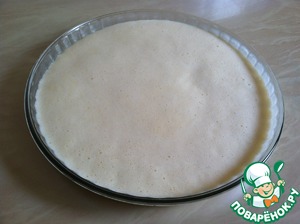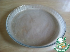 Для такой запеканки лучше выбрать плоскую форму. Диаметр моей формы - 26 см. Смазываем форму сливочным маслом и переливаем в нее творожно-яичную массу.