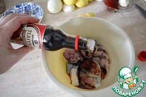 У рыбы убираем хвост, голову и соответственно потроха. Режем на кусочки и поливаем соусом Терияки. Солить дополнительно не нужно. Отставляем в сторону, а тем временем занимаемся остальными ингредиентами.