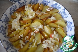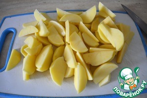 Картофель режем кусочками (я люблю нарезку а-ля по-деревенски - не знаю, как правильно назвать этот способ). Солим. Обжариваем в сковороде на растительном масле до румяного колера. Нам нужен именно цвет и соответственно аромат - проготавливать картофель не надо - он дойдет в духовке.