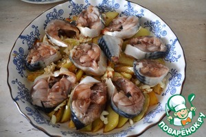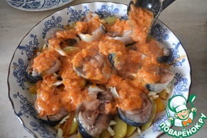 Выкладываем кусочки маринованной скумбрии и поливаем соком, который получился после маринования.