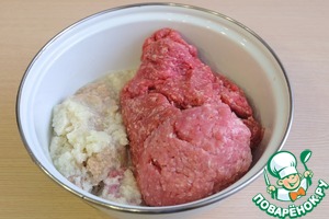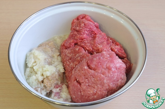 • В миску добавить фарш, добавить хлебно-луковую кашицу.
