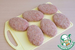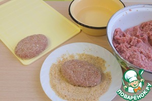 • Смочить руки водой, сформовать котлету, присыпать ее панировочными сухарями с двух сторон.