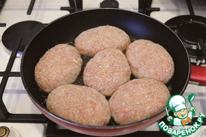 • На сковороду добавить 4 ст. ложки растительного масла, выложить котлеты, включить огонь. Обжарить котлеты на среднем огне до золотистой корочки с двух сторон.