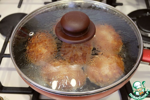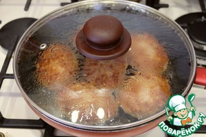 • Затем сковороду с котлетами накрыть крышкой, убавить огонь до минимума и довести котлеты до готовности.