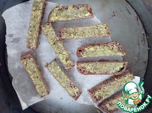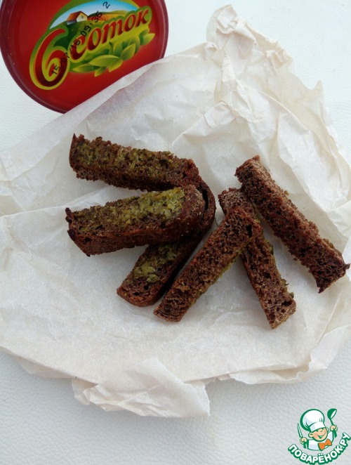 Нарезаем соломкой, выкладываем в форму для запекания застеленную пергаментом. Готовим в духовке при 180° 10-15 минут (время зависит от духовки, хлеба и. т. д).
