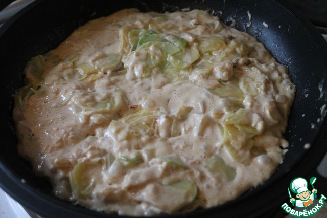Когда овощи будут готовы, добавляем в сковороду заливку и прогреваем 2-3 минуты, помешивая.