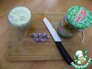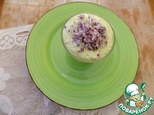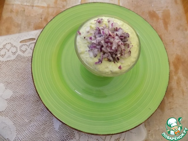 • Выкладываем дип в посуду, в которой будем подавать. Мелко очень режем лук красный.