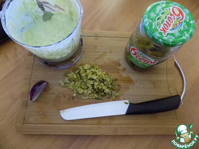 • Огуречки очень мелко режем и добавляем их в массу. Нужно, чтобы они были кусочками. По желанию их тоже можно разбить в общую массу.