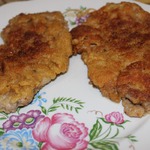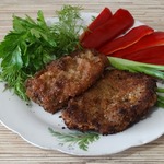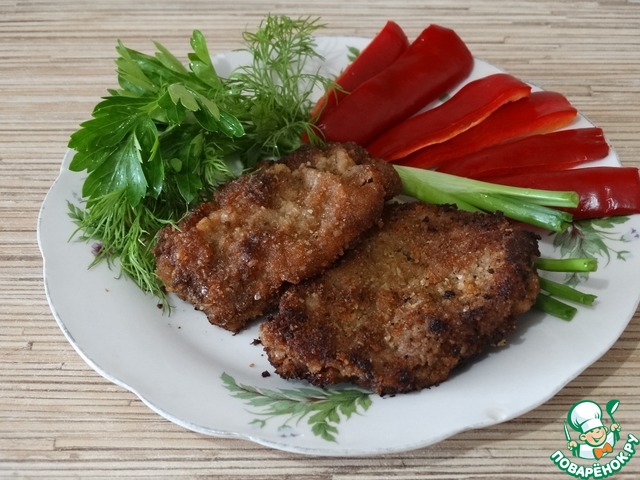Каждую отбивную тщательно обмакнуть в луковый кляр, затем обвалять в сухарях. -