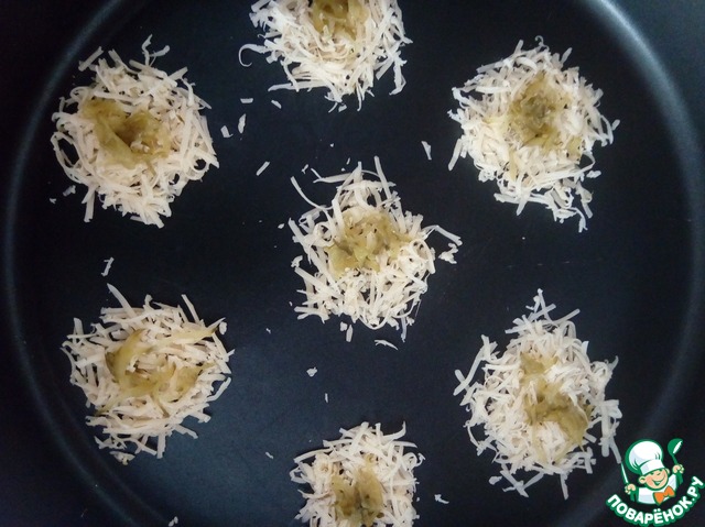• На противень с антипригарным покрытием выкладываем сыр. Сверху выкладываем огурец. Готовим до золотистого цвета 3-5 минут при 180° в духовке.