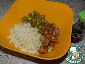 Добавить маринованные грибы. У меня были грибочки паутинники, собственного маринования.