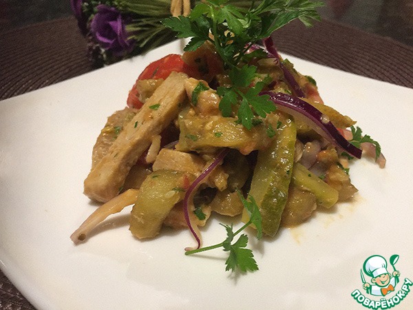 Простой, но очень вкусный, не тривиальный салат с мясом и баклажанами. Заправка из томатов и зелени с оливковым маслом-это отдельная песТня! Салат получается пикантным, острым, "брутальным". Угощайтесь!