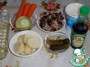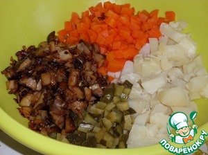 Подготавливаем продукты. Отвариваем овощи в слегка подсоленной воде. остужаем и очищаем. Грибы отвариваем в слегка подсоленной воде 30 минут и остужаем.