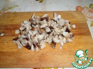 Пока обжаривается лук, нарезаем отварные грибы.