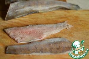 Рыбу почистить, филировать, нарезать небольшими полосками. Обвалять кусочки рыбы в крахмале.