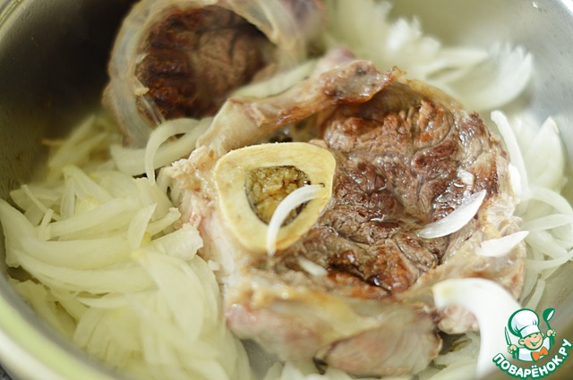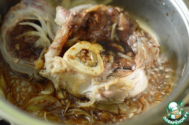 Добавить мед, соевый соус, перемешать. Влить бульон, или воду и готовить на медленном огне под крышкой, пока мясо не будет мягким.