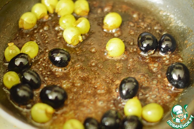 За 15 минут до готовности мяса в сковороде разогреть сливочное масло. Добавить ягоды винограда, посыпать сахаром, влить соевый соус. Помешивая готовить пару минут.