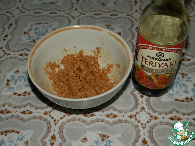 • Для начала надо сварить 3 яйца вкрутую, остудить. Затем "замариновать» манку для набухания. В небольшую посуду насыпать манку, влить соевый соус маринад Teriyaki. Хорошо перемешать и пока отставить в сторонку.