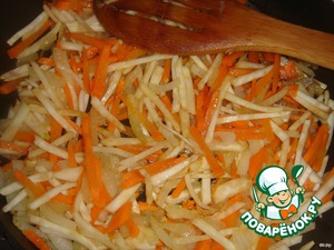 Готовлю зажарку, обжаривая на жире лук, морковь и корень сельдерея (или петрушки).