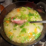 Для начала нужно сварить бульон. Соотношение грудинки и сырокопченого окорока должно быть 2:1. Хорошей грудинки в этот раз не было, я взяла ребрышки.