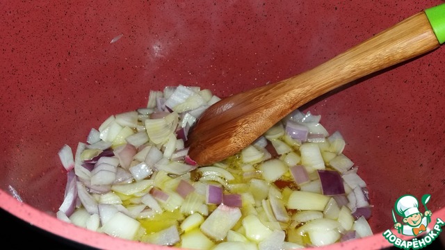 • Следующий момент- масло оливковое (!) ароматное холодного отжима. Рафинированные масла не использовать. Масло разогреть в кастрюле и выложить лук, а чуть позже и чеснок, довести до золотистого цвета.