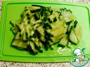 Морковь натереть на терке для корейской моркови, добавить к огурцам