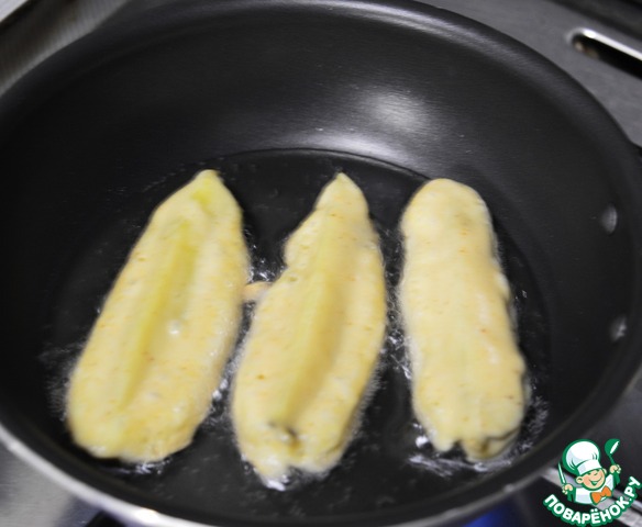 Обмакиваем каждый огуречный брусок в кляр и выкладываем на горячую сковороду с маслом. Обжариваем с двух сторон до румяной корочки.