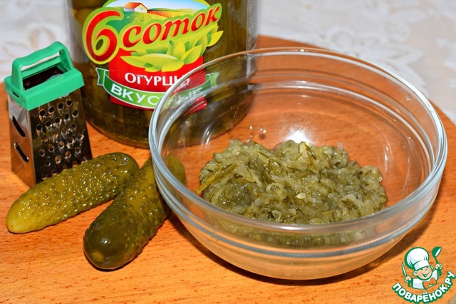 Добавить обжаренный лук и натертые на мелкой терке маринованные огурцы. -